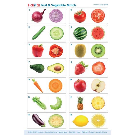 Siin on 14 paari siledast 1 sentimeetri paksusest vineerist valmistatud 7 x 7 cm ruudukujulist plaati. Plaatide ühele küljele on trükitud ilusad värvilised fotod 14-st tervest erinevast puu- ja köögiviljast ning 14 plaati kujutavad vastavate viljade läbilõiget. Plaate on väikestel kätel lihtne haarata ja neid ümber pöörata.