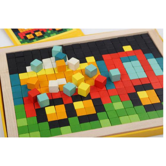 Komplekti kuulub 20,5 x 16,5 cm pildiraam, 400 värvilist puidust kuubikuid (1 cm) – pikslit, 7 pildiskeemi (5 - mitmevärvilist ja 2 – mustvalget üllatust), 1 värvikaart – vihje värvide sobitamiseks.